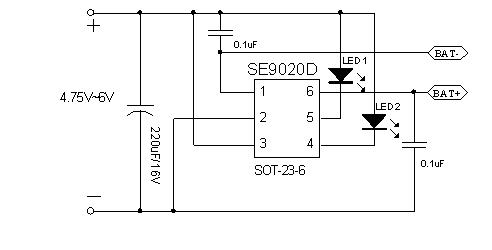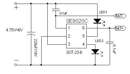 SE9020C,字母C表示color的意思,支持七彩燈模式。SE9020D,字母D表示Double的意思,支持閃燈模式。在七彩燈的電路中, LED1燈用于顯示電源和電池是否連接,七彩燈用于指示充電狀態(tài)。充電時(shí),七彩燈閃亮,充電完成后,七彩燈熄滅。在閃燈電路中, LED1燈用于顯示電源和電池是否連接,LED2燈用于顯示充電狀態(tài)。充電時(shí),LED2燈閃亮,充電完成后,LED2燈熄滅。